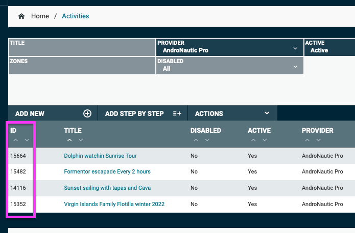 Desde el backoffice accedemos al listado de actividades y en la primera columna encontramos el ID.